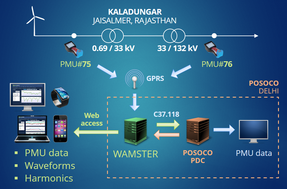 WAMSTER server installed in POSOCO is used as a wireless bridge between PDC located in National Load Dispatch Centre (NLDC), New Delhi and remote wind park in desert area of Rajasthan and a windmill testing facility in Tamil Nadu. Synchrophasors are received by WAMSTER server through GPRS network and are forwarded to NLDC PDC over IEEE C37.118 protocol.